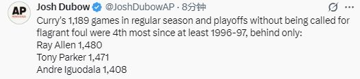 数据显示,自1996-97赛季以来,库里连续1189场零恶犯能排在第4位,在他前面的是雷-阿伦(连续1480场)、托尼-帕克(1471场)以及库里的前队友伊戈达拉(1408场)。