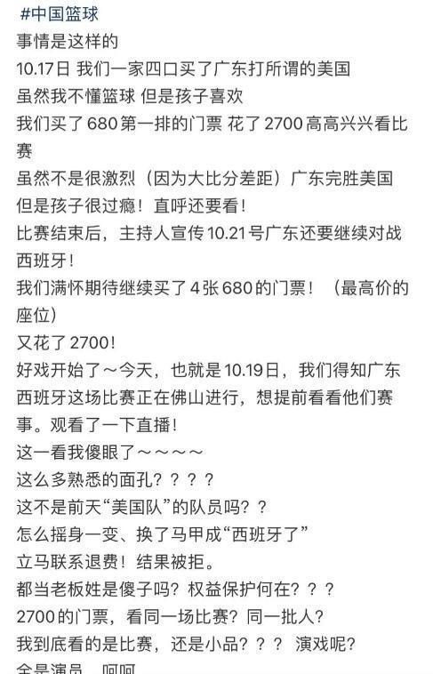 以下是一名现场看球球迷的爆料内容,10月17日,该球迷一家四口买了广东队对阵美国队的一场比赛门票,自己孩子非常喜欢看,买了680的第一排门票花了2700。小孩看后觉得非常好,直呼还要看下一场,也就是10月21日广东队和西班牙赫罗纳男篮的比赛。于是他们继续买了4张680的门票,同样是2700。