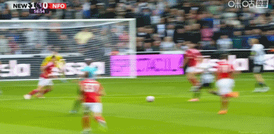 第58分钟,打破僵局,吉马良斯一脚世界波破门,纽卡1-0诺丁汉森林