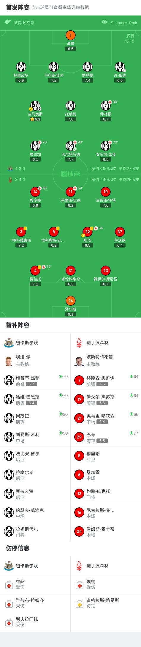 纽卡2-0诺丁汉森林,吉马良斯世界波,沃尔特马德点射+中楣
